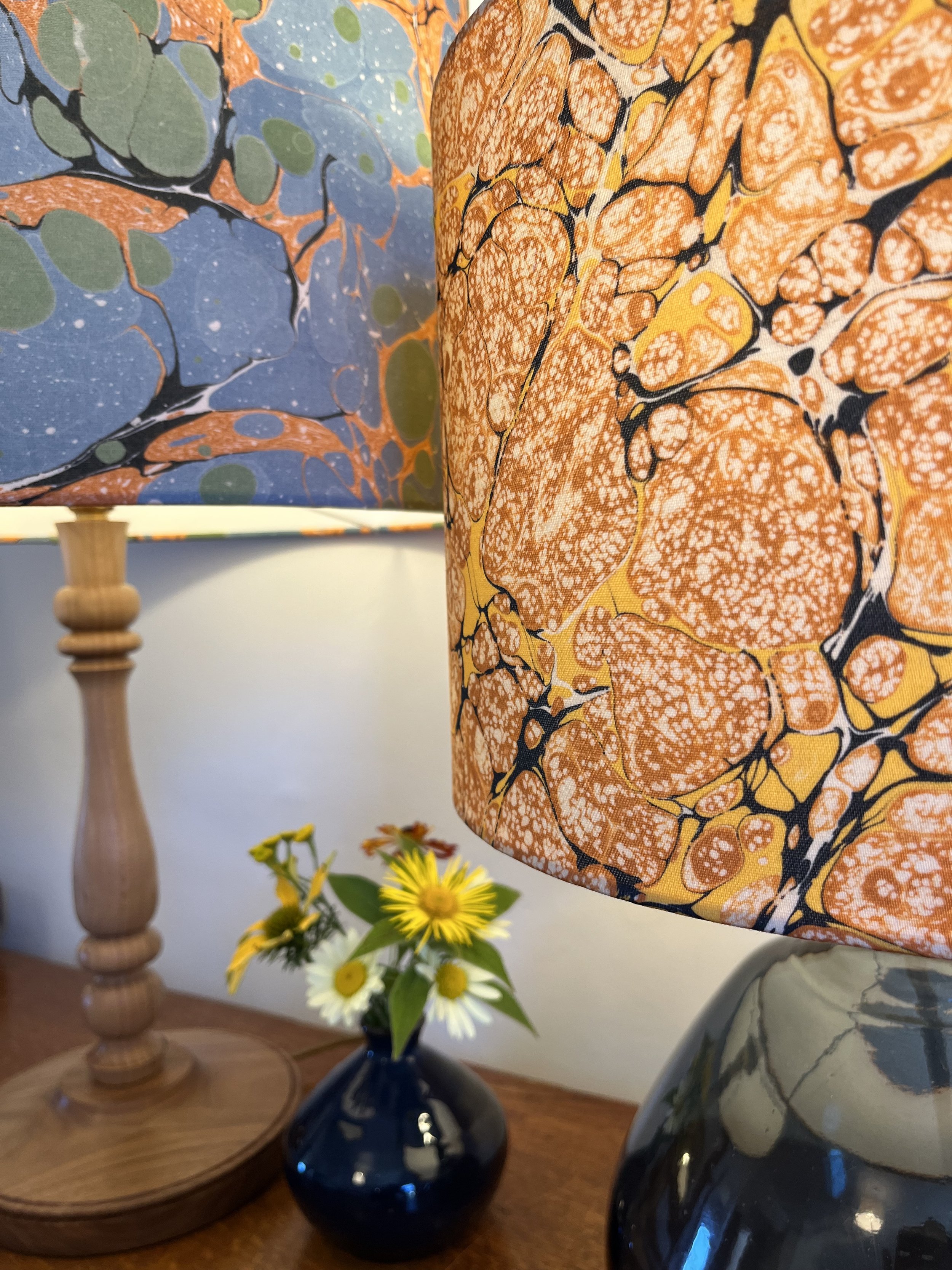 New! Two marbled fabric lampshades in glorious, vibrant colours that glow when illuminated. Available in a range of sizes and shapes for a traditional or retro vibe.